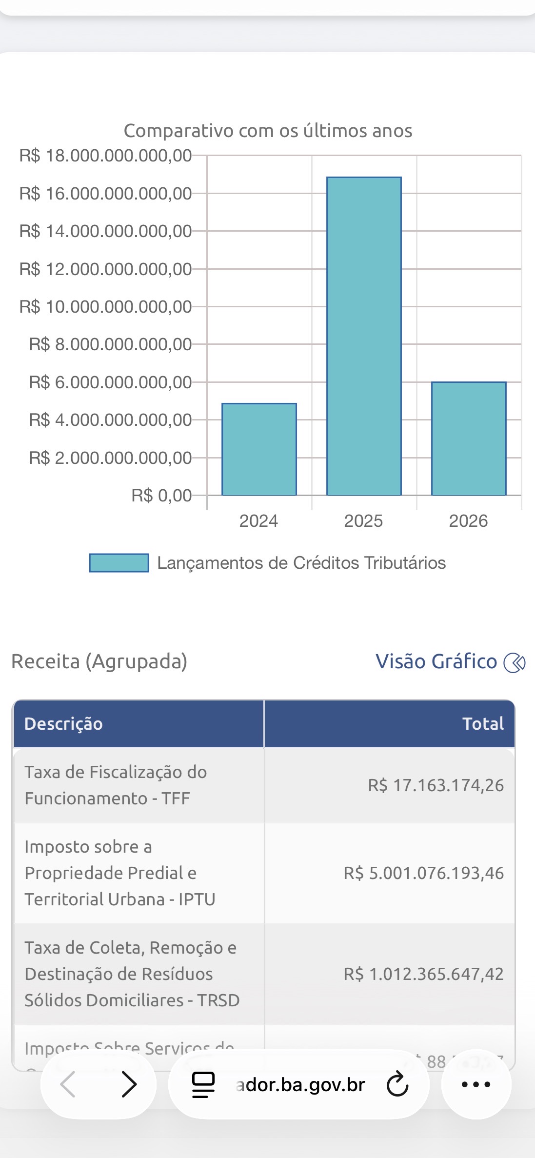 O contribuinte de Salvador, num breve acesso ao site da Secretaria Municipal da Fazenda – SEFAZ, na página TRANSPARÊNCIA, pode tomar conhecimento do montante do lançamento dos créditos tributários referentes ao IPTU 2026: R$ 5.001.076.193,46 (Cinco bilhões, um milhão, setenta e seis mil, cento e noventa e três reais e quarenta e seis centavos).