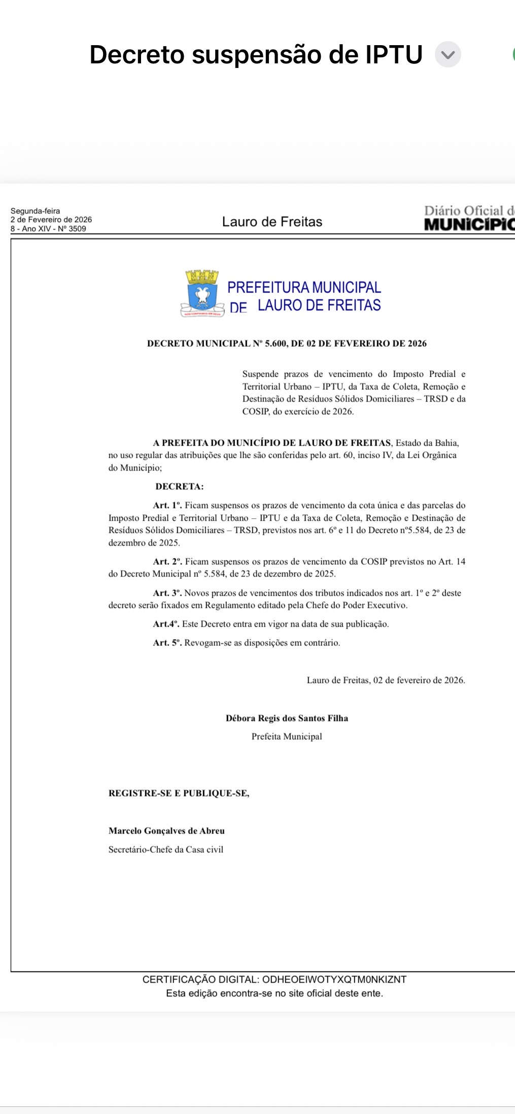 Diante da enorme repercussão em relação ao aumento dos tributos em Lauro de Freitas, causados pela Lei Complementar 01/25, a Prefeitura, alegando inconsistência no sistema de lançamento, publicou o decreto suspendendo o vencimento do IPTU, TRSD e COSIP do exercício de 2026.