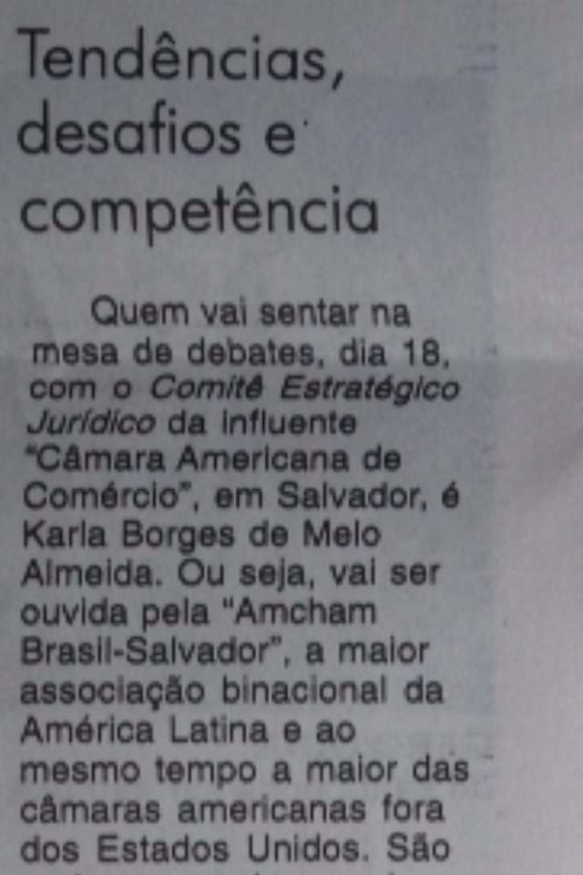 Quem vai sentar na mesa de debates, dia 18, com o Comitê Estratégico Jurídico da influente “Câmara Americana de Comércio”, em Salvador, é Karla Borges de Melo Almeida. Ou seja, vai ser ouvida pela “Amcham Brasil- Salvador”, a maior associação binacional da América Latina e ao mesmo tempo a maior das câmaras americanas fora dos Estados Unidos. São nada menos do que cinco mil empresas associadas, 15 por cento delas de ação multinacional.