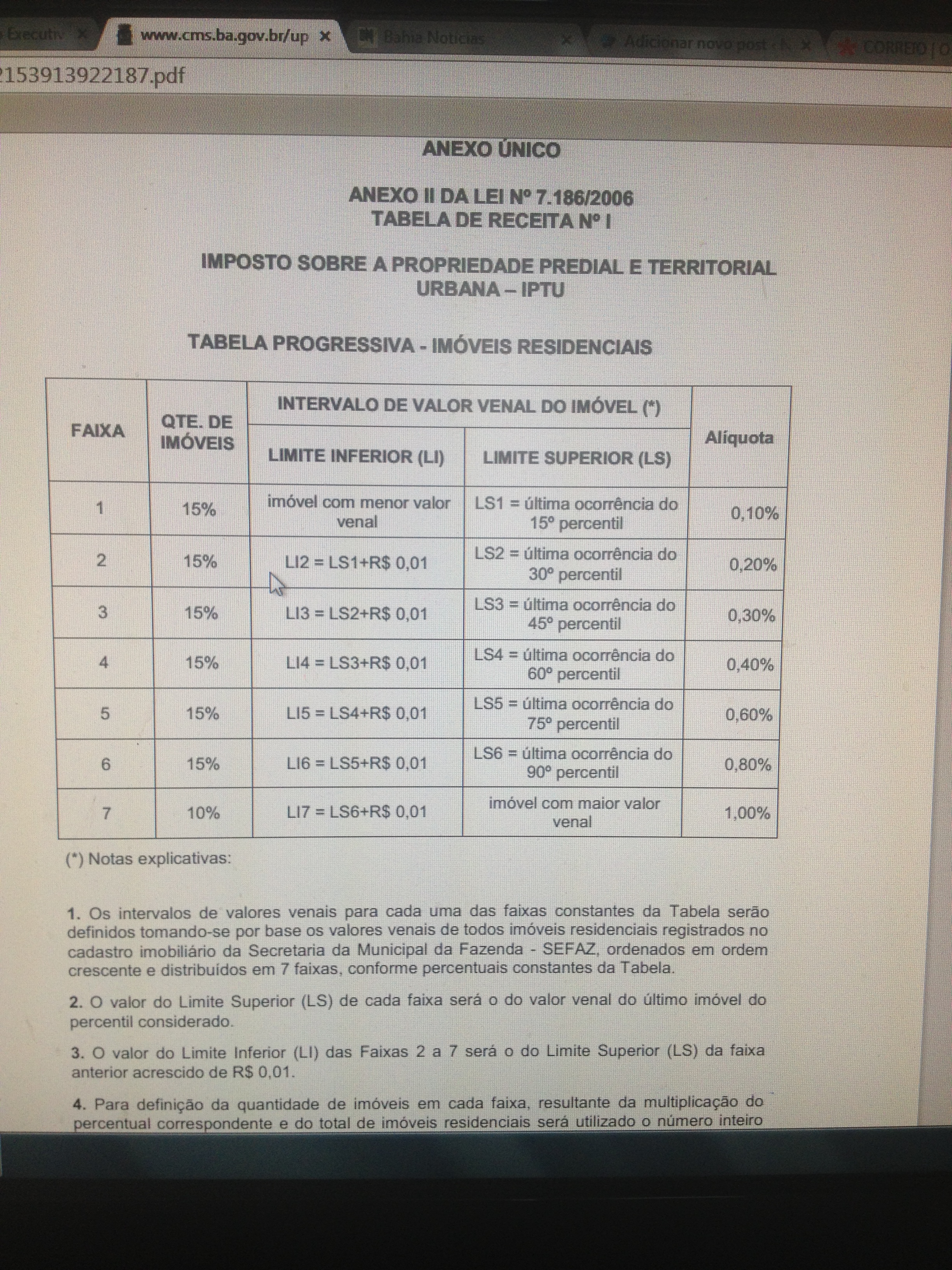 Vejam como será a Tabela de Receita do IPTU para os imóveis residenciais. As alíquotas irão variar de acordo com o valor venal dos imóveis, e não mais com o padrão construtivo. Aguardem o artigo da Tribuna da Bahia de segunda (09/07/13) que tentará decifrar a tabela abaixo para os leitores.