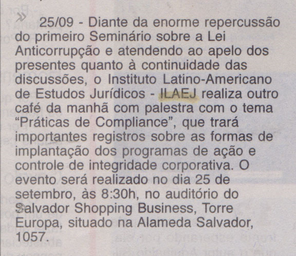 Coluna da Tribuna da Bahia divulga Seminário sobre As práticas de Compliance