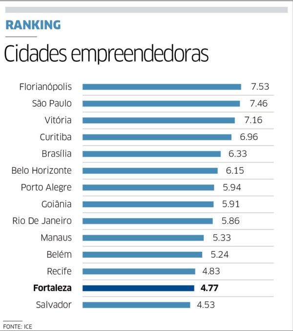 O estudo, realizado pela Endeavor Brasil, em parceria com a Bain&Company, busca examinar o ecossistema empreendedor de um grupo de capitais brasileiras, para apontar aquelas que possuem condições mais propícias para o desenvolvimento de empresas e mostrar como ainda podem evoluir. Além de Fortaleza, foram analisadas as seguintes capitais: Manaus, Belém, Recife, Salvador, Brasília, Goiânia, Vitória, Belo Horizonte, Rio de Janeiro, São Paulo, Curitiba, Florianópolis e Porto Alegre. A escolha foi feita porque essas cidades possuem regiões metropolitanas com mais de 1% das empresas de alto crescimento do Brasil, segundo o Instituto Brasileiro de Geografia e Estatística (IBGE). Apesar do crescimento econômico nos últimos anos, a Capital cearense teve o segundo pior resultado no ICE 2014. Com 4,77 pontos, ficou em 13º lugar no ranking, ganhando só de Salvador (4,53), última colocada. A performance empreendedora das 14 metrópoles é resultado de um conjunto de sete determinantes adotados pela Endeavor Brasil: ambiente regulatório; infraestrutura; mercado; acesso a capital; inovação; capital humano; e cultura.