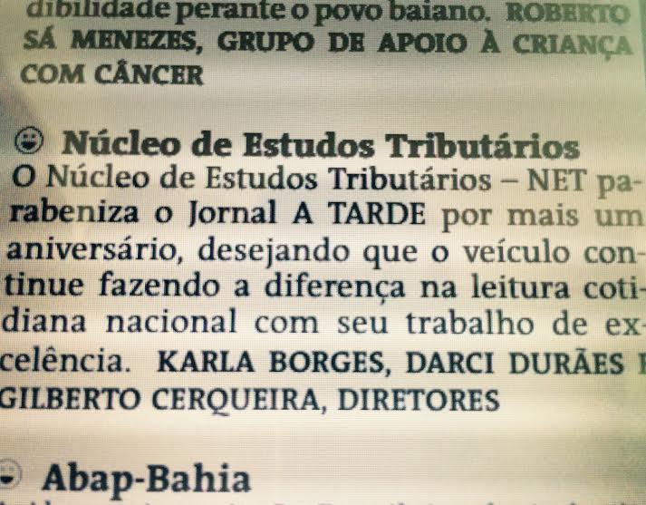 O Núcleo de Estudos Tributários-NET parabenizou o Jornal A Tarde pelos seus 103 anos!
