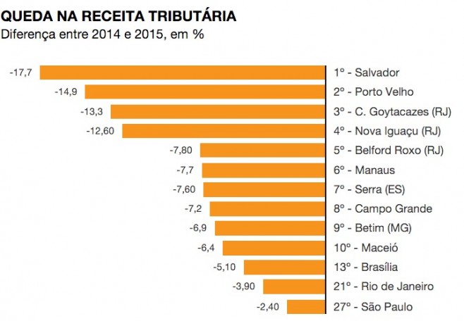 A Folha de São Paulo no mês passado publicou um levantamento sobre a arrecadação dos municípios brasileiros apontando que Salvador apresentou a maior queda de receita tributária dentre todas as cidades do país, num percentual de 17,7% apurado entre os exercícios de 2014 e 2015. Embora tenha havido retração na atividade econômica, a receita do Imposto sobre Serviços (ISS) vem sofrendo diminuição acentuada desde 2013 em decorrência, principalmente, das modificações introduzidas no Código Tributário e de Rendas da capital baiana.