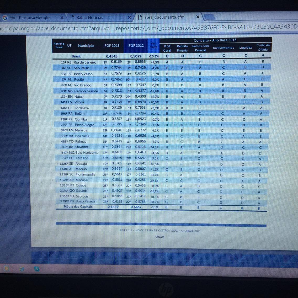 custo da dívida, Firjan, Gastos com pessoal, gestão crítica, gestão em dificuldade, investimentos, liquidez, Receita Própria, Salvador, tabela