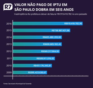 Fonte: http://noticias.r7.com/sao-paulo/prejuizo-com-inadimplencia-do-iptu-mais-que-dobra-em-seis-anos-na-capital-paulista-20032017