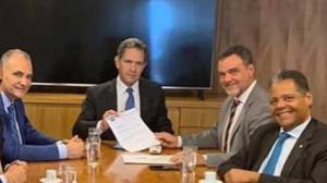 Deputados Federais da Bahia entregaram ontem ao Presidente do Superior Tribunal de Justiça, João Otávio de Noronha, um manifesto em defesa da criação do Tribuna Federal da 8ª Região em Salvador. A iniciativa visa ampliar o acesso da população baiana à justiça, assim como dar efetividade e celeridade aos processos. Na foto, o Presidente, com Nelson Pelegrino, Daniel Almeida e Antônio Brito.
