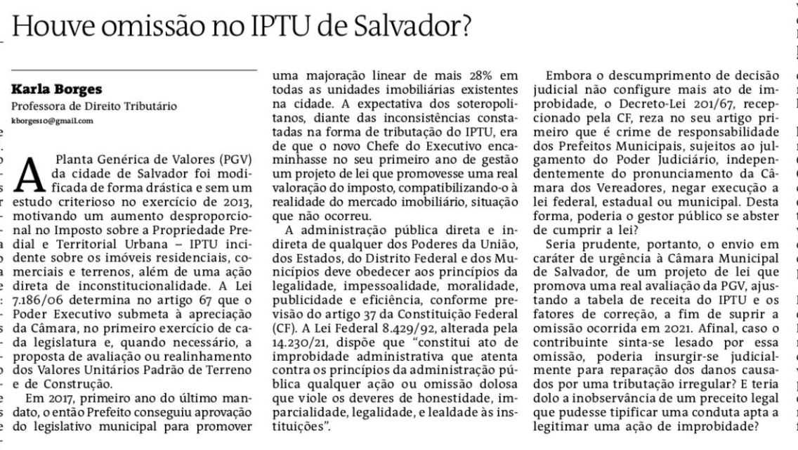 Artigo de Karla Borges sobre o IPTU de Salvador é destaque no Jornal A Tarde de hoje
