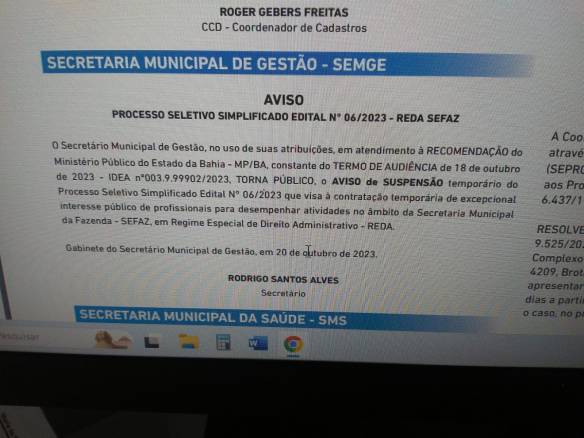 A suspensão do Processo Seletivo Simplificado Edital n. 06/23, o REDA, para contratação temporária de profissionais por excepcional interesse público, instituído pela Secretaria Municipal da Fazenda de Salvador – SEFAZ, da Prefeitura de Salvador, foi publicada no Diário Oficial do Município de Salvador de 21/10/23, do último sábado.