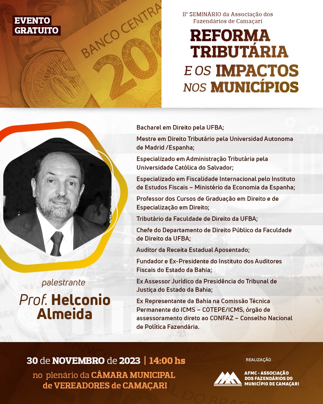 Os professores e auditores fiscais Karla Borges e Helcônio Almeida proferirão palestra no próximo dia 30/11, quinta-feira, às 14 h, na Câmara Municipal de Camacari, sobre a Reforma Tributária e os Impactos nos Municípios, no II Seminário da Associação dos Fazendários de Camacari. A entrada é franca.