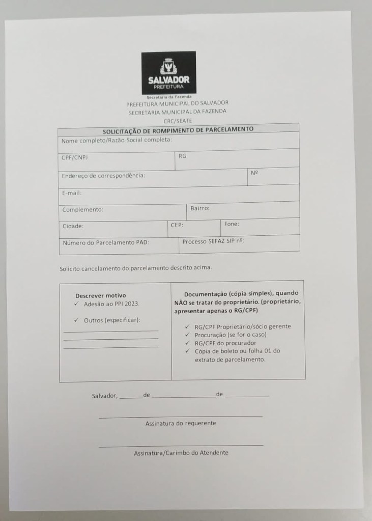 Esse pedido pode ser feito presencialmente na SEFAZ, preenchendo um “Formulário de Solicitação de Rompimento de Parcelamento”, anexando cópia simples dos seguintes documentos: RG/CPF do proprietário ou gerente, procuração (se for o caso), RG/CPF do procurador e cópia do boleto ou a primeira folha do extrato do parcelamento em andamento que se pretende cancelar. Após dois dias, o débito ficará disponível para fazer o PPI.