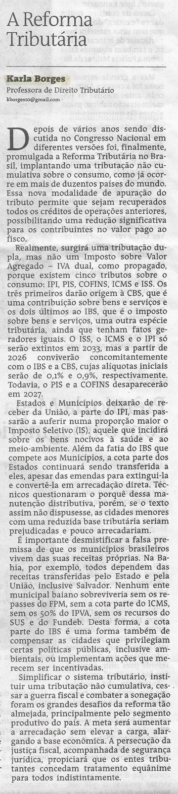 Jornal A Tarde publica hoje artigo de Karla Borges sobre a reforma tributária