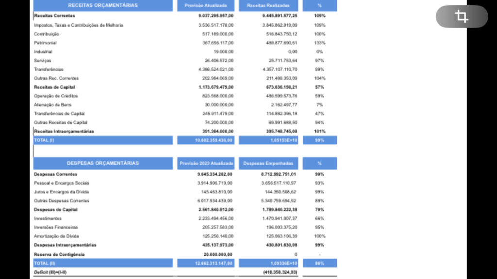 Observem que as despesas da Prefeitura de Salvador em 2023 ultrapassaram R$ 10.9 bilhões, bem superior às receitas que foram de aproximadamente R$ 10.5 bilhões.
