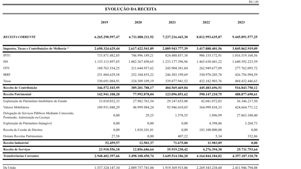 Em 2023, a sua arrecadação superou um bilhão e meio de reais, conforme o gráfico abaixo da evolução de receita municipal.