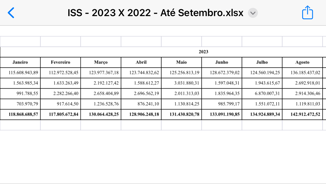 A primeira tabela refere-se a arrecadação mensal de ISS em 2022 e a segunda em 2023.