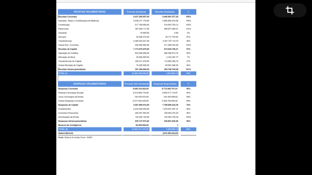 A previsão de arrecadação de Salvador em 2023 foi superior ao previsto, conforme demonstra o quadro abaixo. As receitas transferidas da União e do Estado da Bahia corresponderam a 99% do projetado. Os investimentos ficaram quase 40% a menos do que a estimativa feita. A frustração maior deu-se nas operações de crédito, uma vez que o município esperava receber empréstimos num valor superior a oitocentos milhões, mas ingressou em cofres públicos o montante de quase meio bilhão de reais.