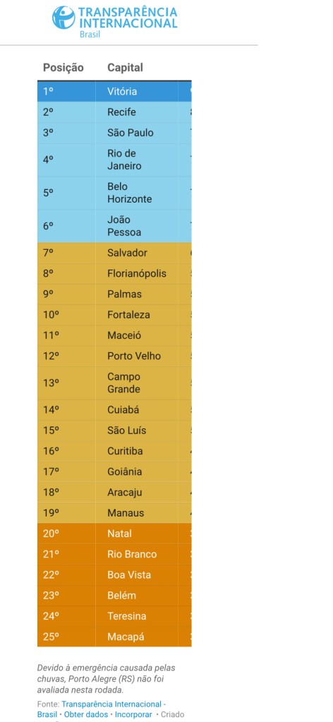 Cada capital recebeu uma nota de 0 a 100, onde 0 representa o pior resultado e 100 o melhor em matéria de transparência. A avaliação não inclui o Distrito Federal nem Porto Alegre, que não foi incluída no comparativo com as outras capitais devido à crise das enchentes.