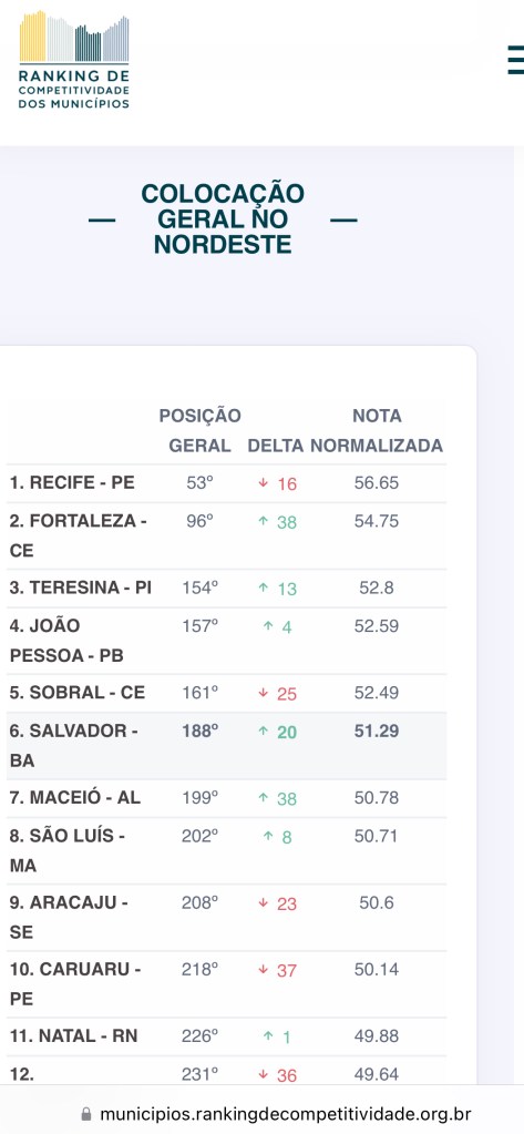 Salvador perde para Recife, Fortaleza, Teresina, João Pessoa e Sobral no ranking de competitividade do Nordeste e está na posição 188o no Brasil