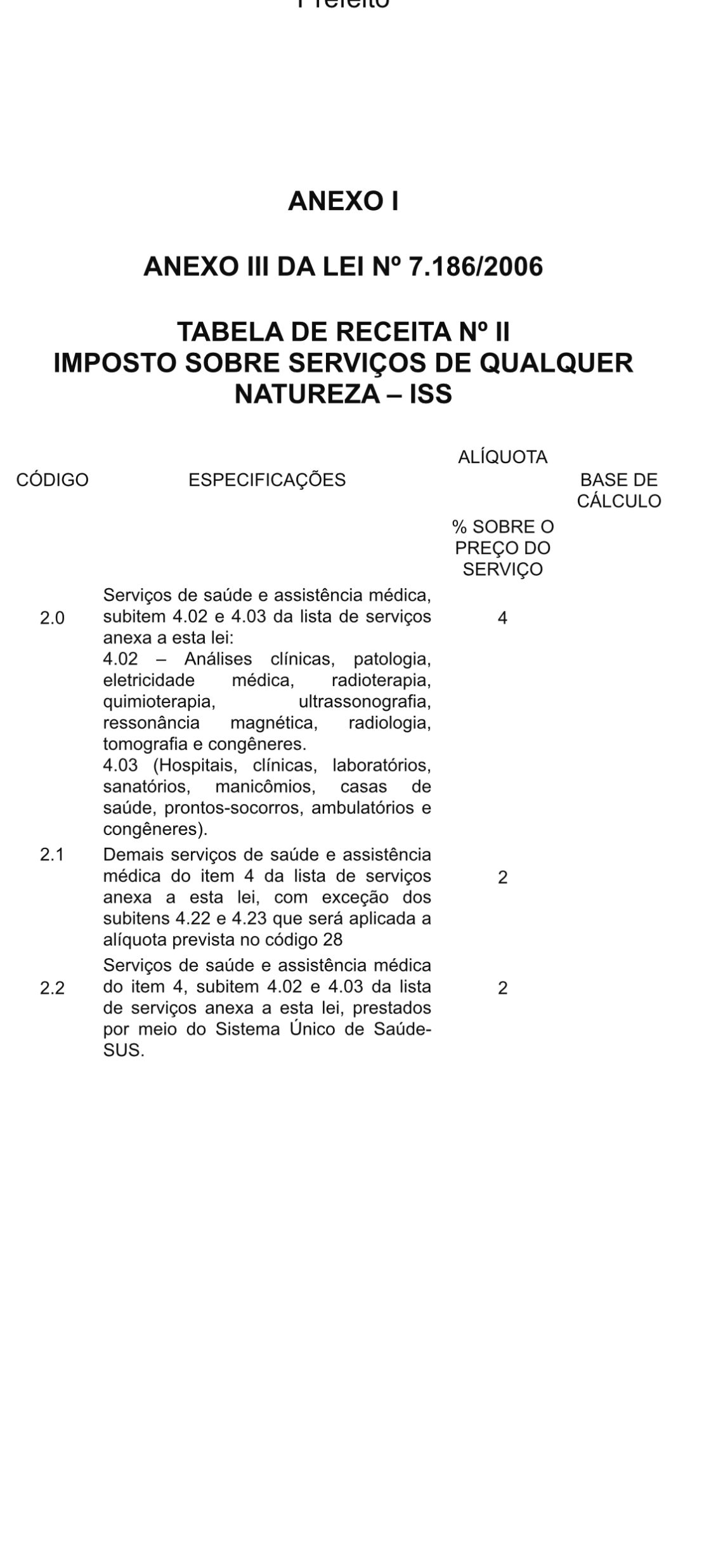 Art. 7º A alíquota do Imposto Sobre Serviços de Qualquer Natureza – ISS prevista no código 2.0 da Tabela de Receita nº II do Anexo I da Lei nº 7.186, de 27 de dezembro de 2006, passa a vigorar na forma constante no Anexo I desta Lei.