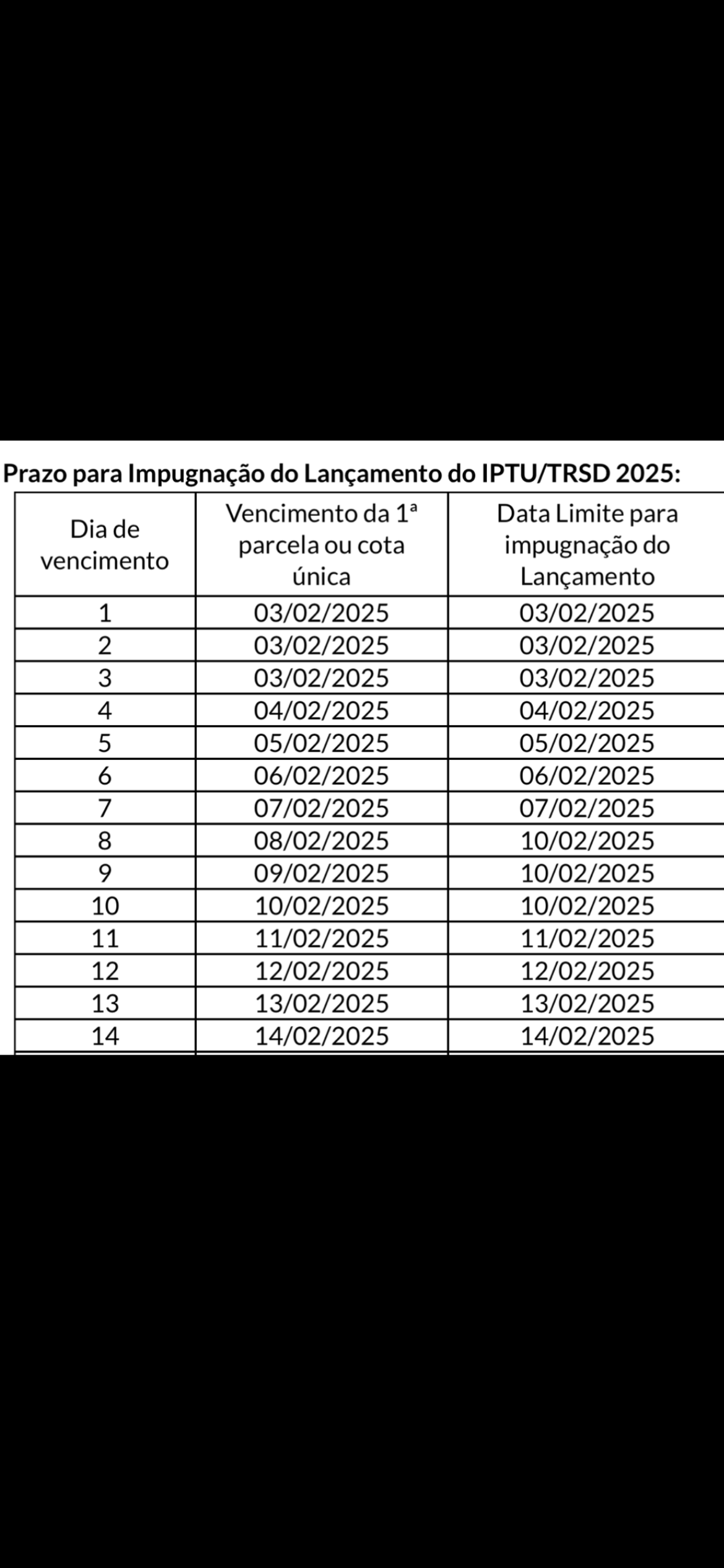 A impugnação pode ser apresentada até as datas previstas nas tabelas anexas, quando o contribuinte identificar erro ou não concordar com um ou mais dados utilizados para o cálculo do IPTU ou da TRSD do exercício de 2025.