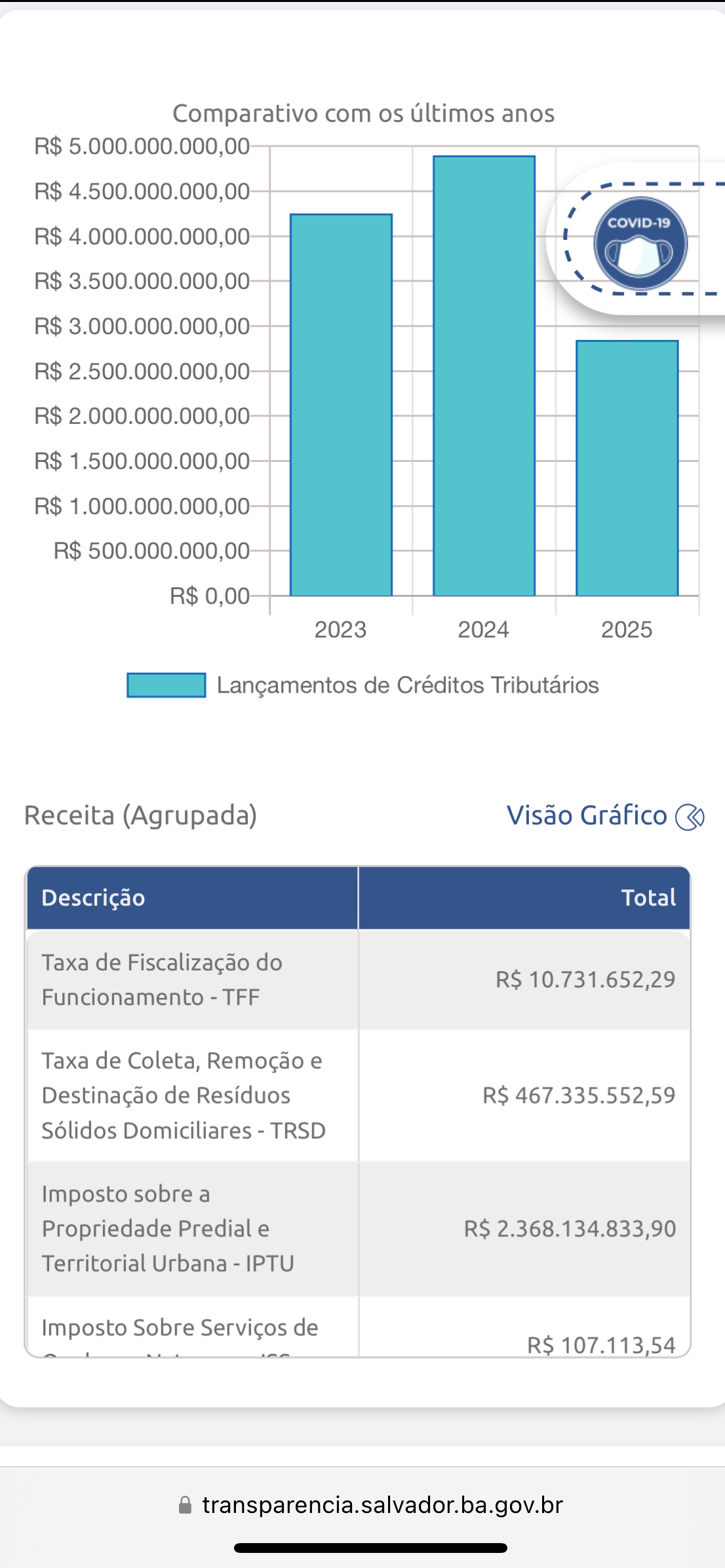 O portal Transparência no site da SEFAZ de Salvador revela que o lançamento dos créditos tributários do IPTU para o exercício de 2025 totalizou R$ 2.368.134.833,90. Entretanto, a expectativa de ingresso de receita da Prefeitura de Salvador para o imposto predial, conforme previsão orçamentária é de R$ 1.171.259.000,00, ou seja, quase metade do montante lançado, presumindo uma inadimplência de quase 50%.