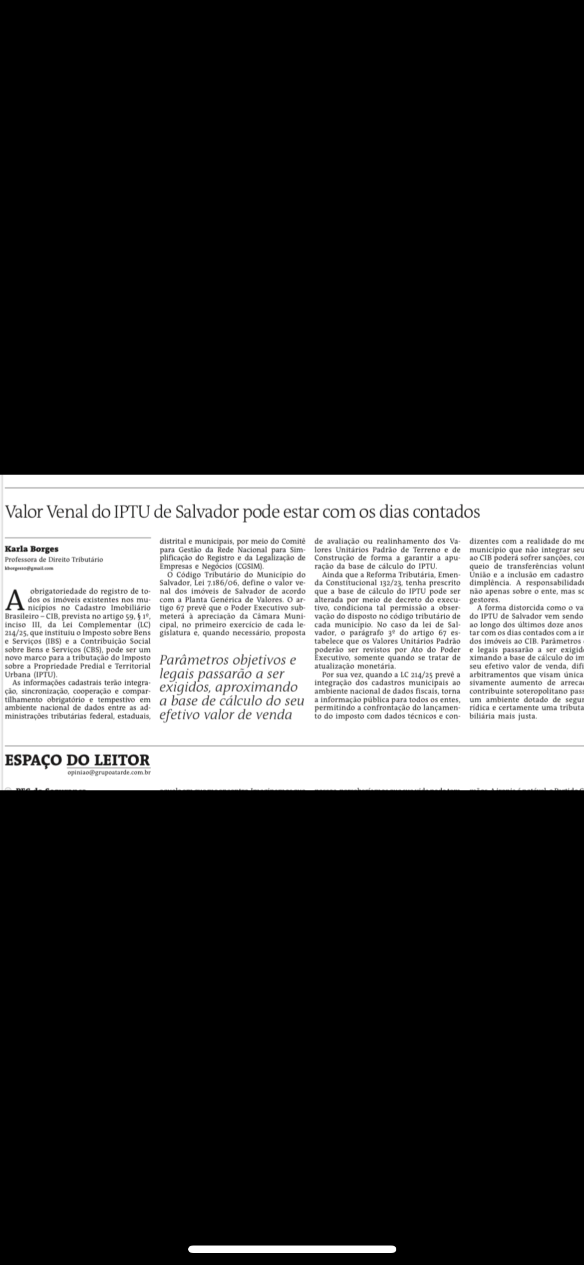 Jornal A Tarde publica artigo de Karla Borges sobre o Valor Venal do IPTU