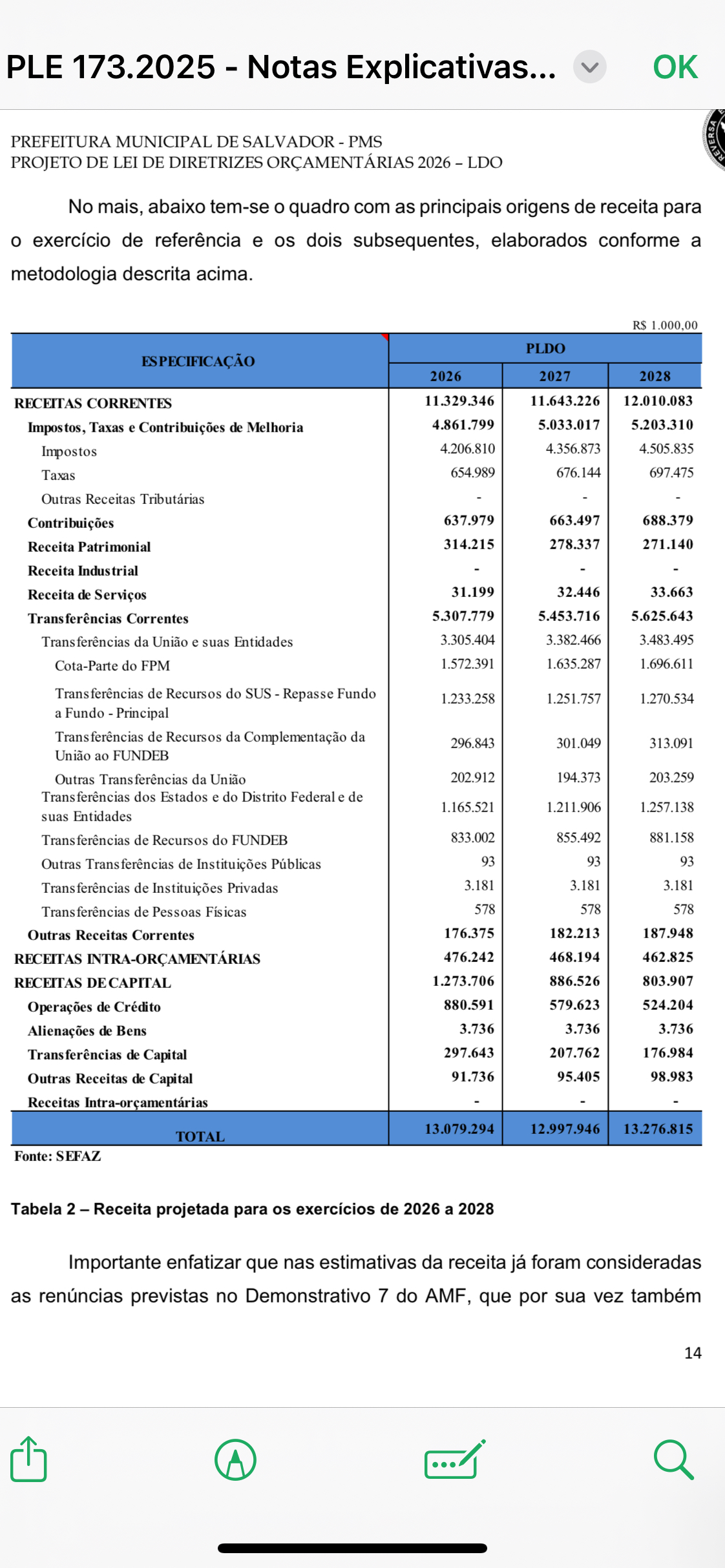 Para o período 2026/2028 foram estimadas receitas num total aproximado de R$ 13,1 bilhões; R$ 13,0 bilhões, R$ 13,3 bilhões respectivamente, ancoradas de forma expressiva nas transferências constitucionais da União e do Estado da Bahia tais como FPM, FUNDEB, SUS, ICMS e IPVA (mais de cinco bilhões e trezentos milhões de reais para 2026), uma vez que as receitas originárias dos impostos e taxas municipais como IPTU, ISS, ITIV, TFF, TRSD e outras representam um montante menor, conforme o quadro anexado e apresentado na mensagem enviada ao legislativo soteropolitano.
