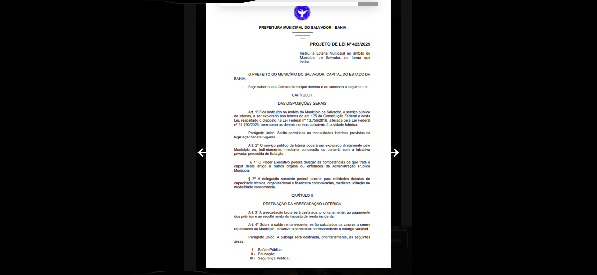 Em Salvador, o Poder Executivo encaminhou em setembro um projeto de lei, PL 423/2025, ao Legislativo, prevendo a criação de uma loteria municipal na capital baiana, visando angariar mais recursos, podendo ser explorada diretamente pelo município ou através de concessão para a iniciativa privada.