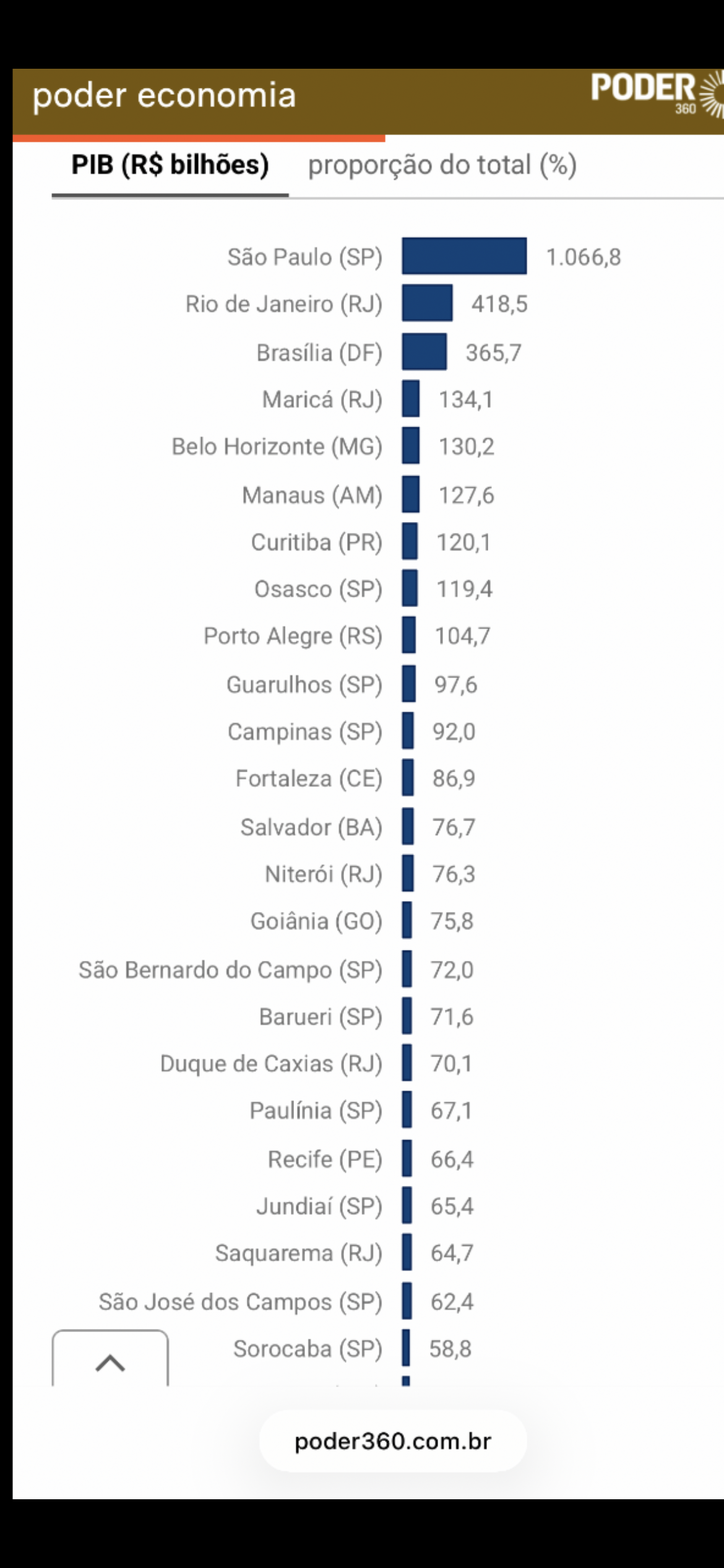 Na lista, há 10 municípios do Estado de São Paulo, representando R$ 1,77 trilhão do PIB. Há 5 do Rio de Janeiro, com R$ 764 bilhões. Excluindo as capitais, estão 9 municípios paulistas, 4 fluminenses e 1 mineiro –todos da região Sudeste. As 25 cidades detêm um PIB de R$ 3,74 trilhões, o que corresponde a 34,2% do PIB nacional.