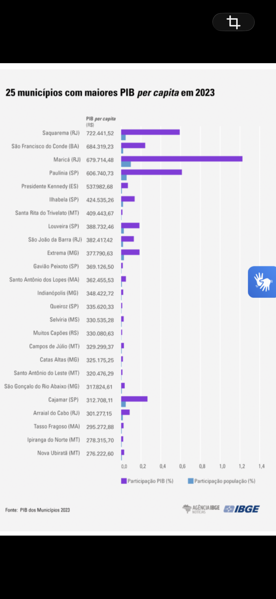 Em 2023, os dez municípios brasileiros com maiores PIB per capita concentraram apenas 0,3% da população, mas responderam por 3,4% do PIB nacional. Saquarema (RJ) liderou o ranking, com R$ 722,4 mil por habitante, impulsionada pela extração de petróleo e gás, atividade que também sustentou o desempenho de Maricá (RJ), Presidente Kennedy (ES), Ilhabela (SP) e São João da Barra (RJ). A média nacional foi de R$ 53,9 mil.