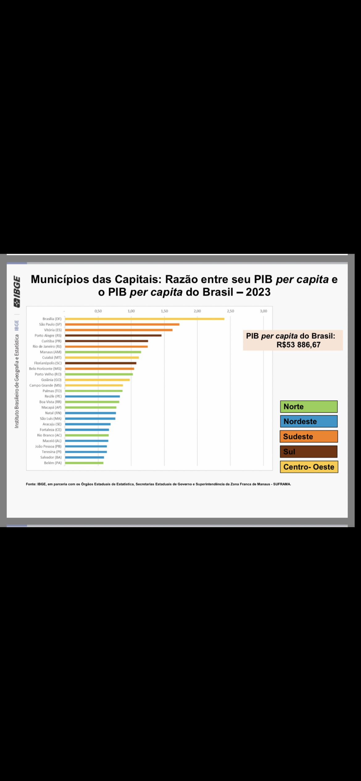 Entre as capitais, Brasília (DF) apresentou o maior PIB per capita (R$ 129,8 mil), valor 2,41 vezes superior à média nacional de R$ 53,9 mil. Belém (PA) teve o menor desempenho entre as capitais (R$ 31,1 mil), com razão de 0,58. No histórico, sete capitais — concentradas principalmente no Sudeste e Sul, além de Brasília R$ 129.790,44) e Manaus (R$ 61.855,15) — mantiveram valores acima da média nacional.