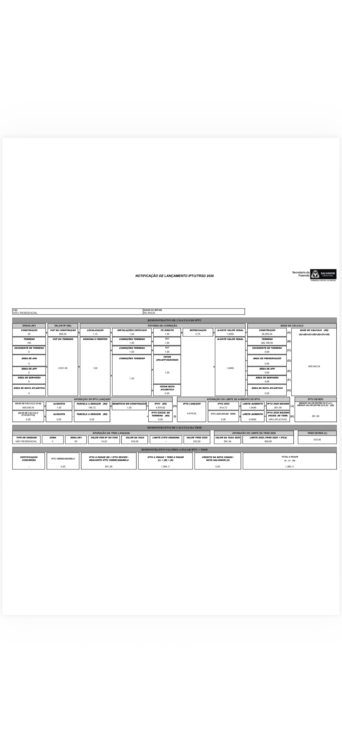 O valor do IPTU 2025 desse imóvel foi de R$ 71,94 e em 2026 subiu para R$ 851,06, uma majoração de 1.083%. Já a TRSD 2026 aumentou 120,67%, saiu de R$ 241,55 em 2025 para R$ 533,05 esse ano.