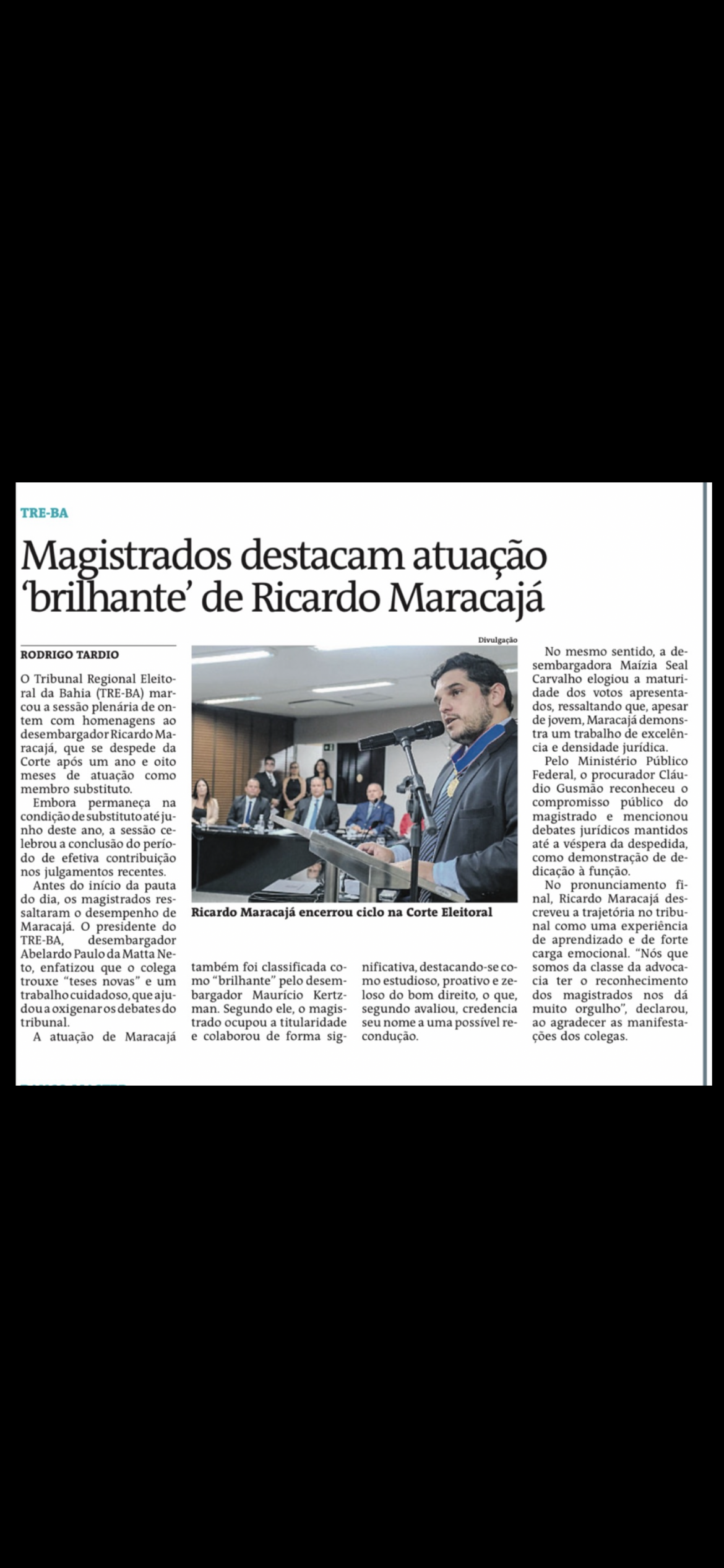 Desembargador Ricardo Maracajá é destaque no Jornal A Tarde de hoje pelo seu brilhantismo no TRE