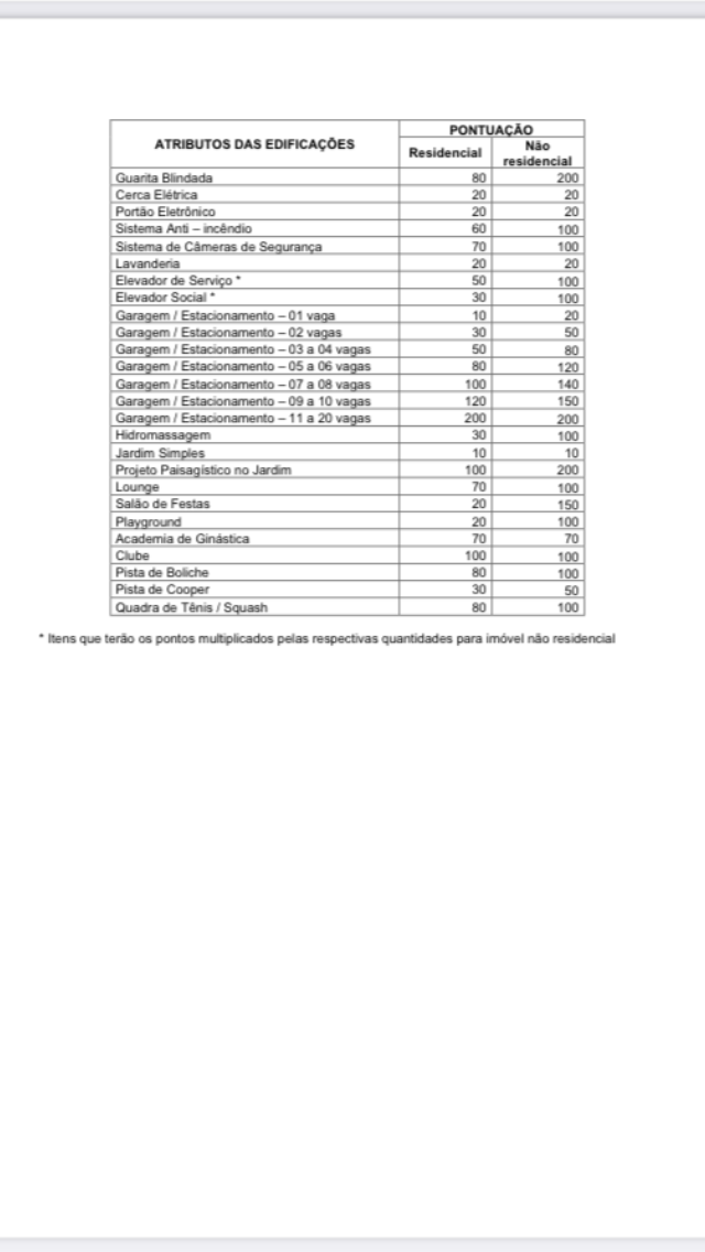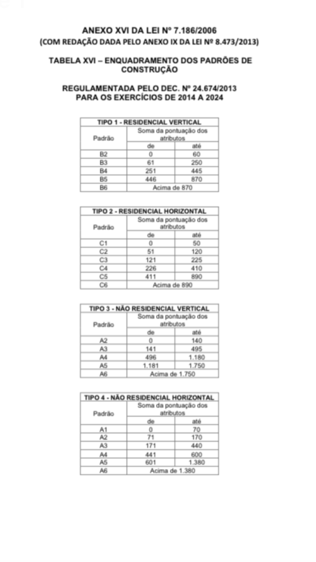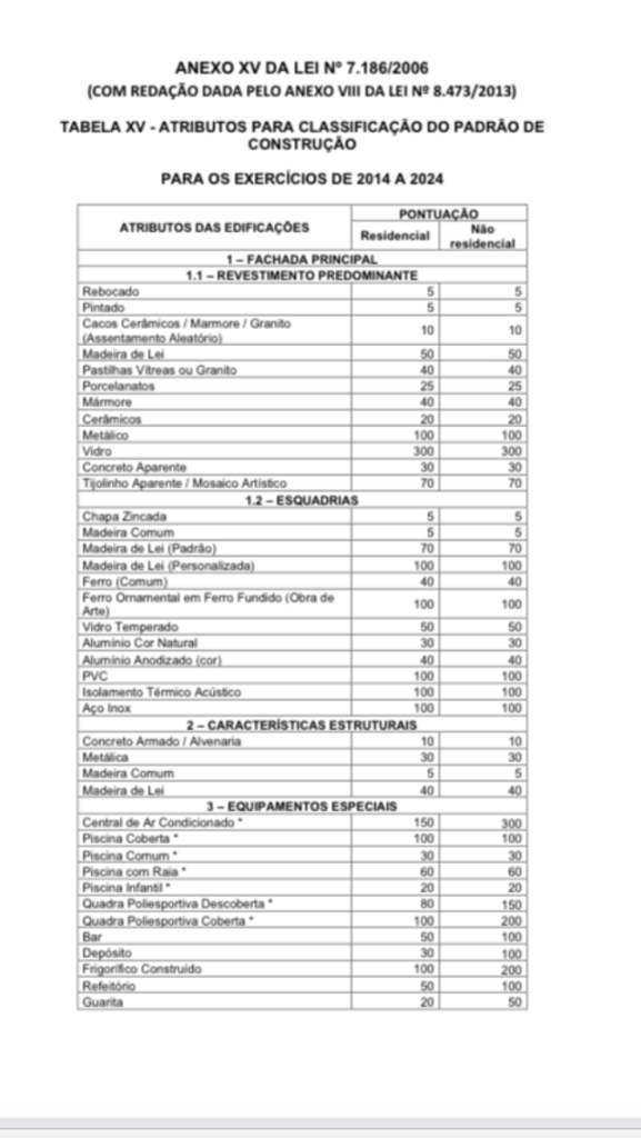 Os atributos para a classificação do padrão de construção estão previstos no anexo XV da Lei 7.186/06.