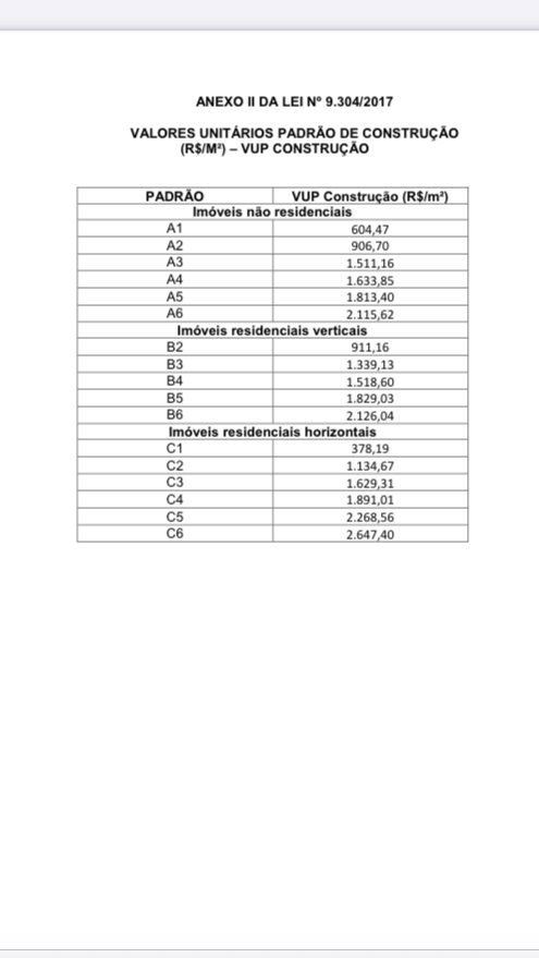 Com o padrão construtivo encontrado, o mesmo que aparece no seu boleto, você segue para a última tabela, o anexo II da Lei 9.304/2017 que identifica o VUP de construção de cada padrão, e terá que ser corrigido monetariamente, de acordo com o IPCA até o exercício que você deseja calcular o IPTU.